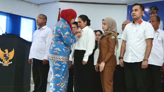 Prosesi pelantikan Pengurus Dekranasda Kabupaten Seram Bagian Barat masa bakti 2026–2030, yang berlangsung di Gedung Hatutelu, Piru, Senin (13/4/2026).